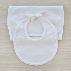 Set para bebé algodón Pima con felpa posterior super absorbente, serán de gran utilidad para el cuidado y la alimentación de tu pequeñita. Cierre con un lacito para regular el tamaño.